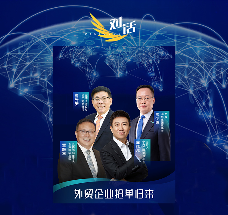 6月3日,CCTV財經頻道《對話》節目中請到家電、紡織服裝、工程機械三個不同領域的外貿領軍企業負責人,海信集團董事長、總裁賈少謙,東方國際集團黨委書記、董事長童繼生,廣西柳工機械股份有限公司黨委書記、董事長兼CEO曾光安,共同分享他們搶單的秘訣與心得。
