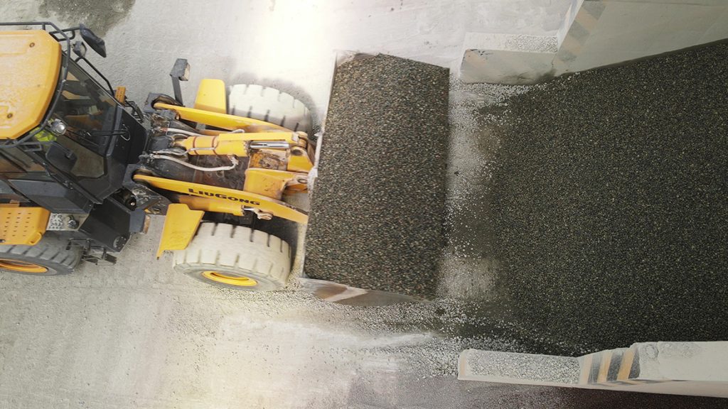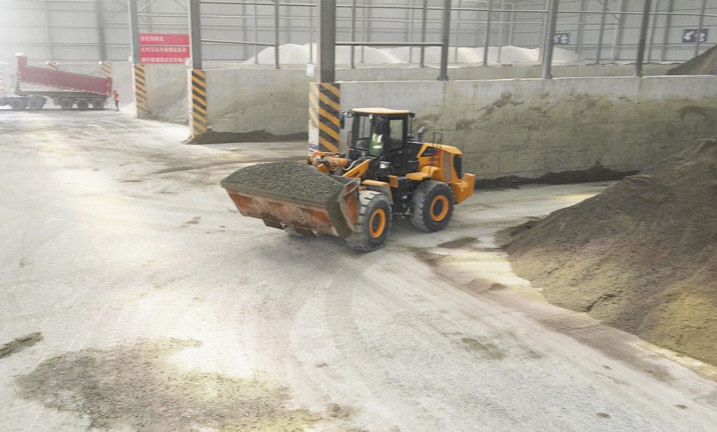 堆滿砂石的攪拌廠內,天一剛亮就開始忙碌起來。4臺黃色的柳工裝載機,不停在料堆之間往返——2臺856H負責挖料,1臺856H MAX收料,另一臺較大的870H則是不斷地往攪拌站中送入砂石。片刻之后,在攪拌站的另一頭,已經混合均勻的混凝土被排在廠門口的一隊隊卡車拉往不同工地。