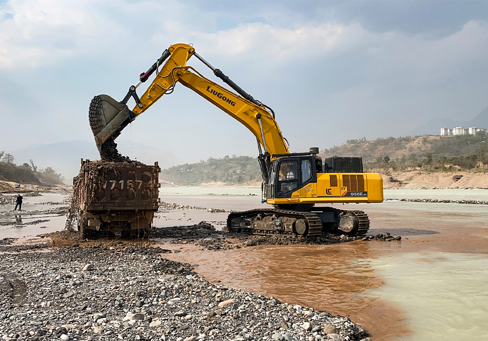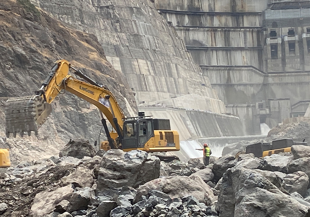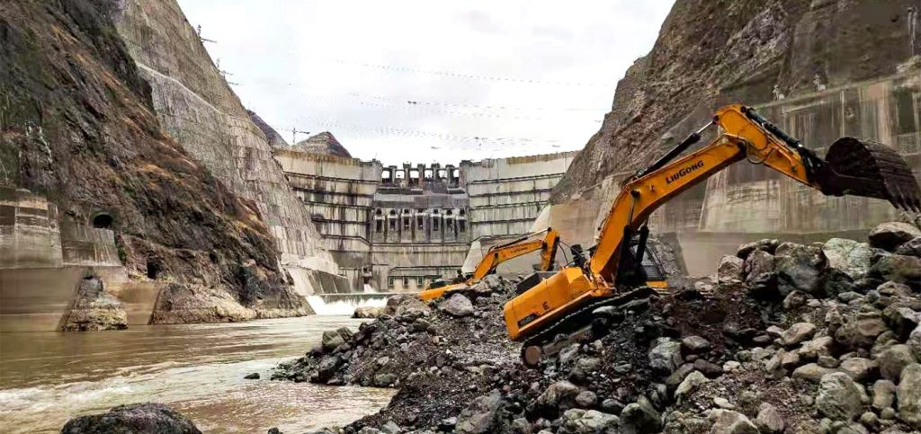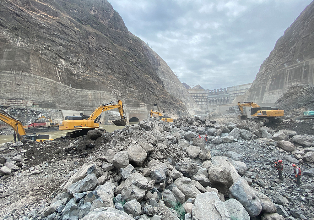 柳工大型挖掘機因為優(yōu)異的表現(xiàn)并沒有因為階段性任務(wù)的完成而離場,而是被施工方留下來,安排到大壩的下游地區(qū),參與河床石頭清理工作。